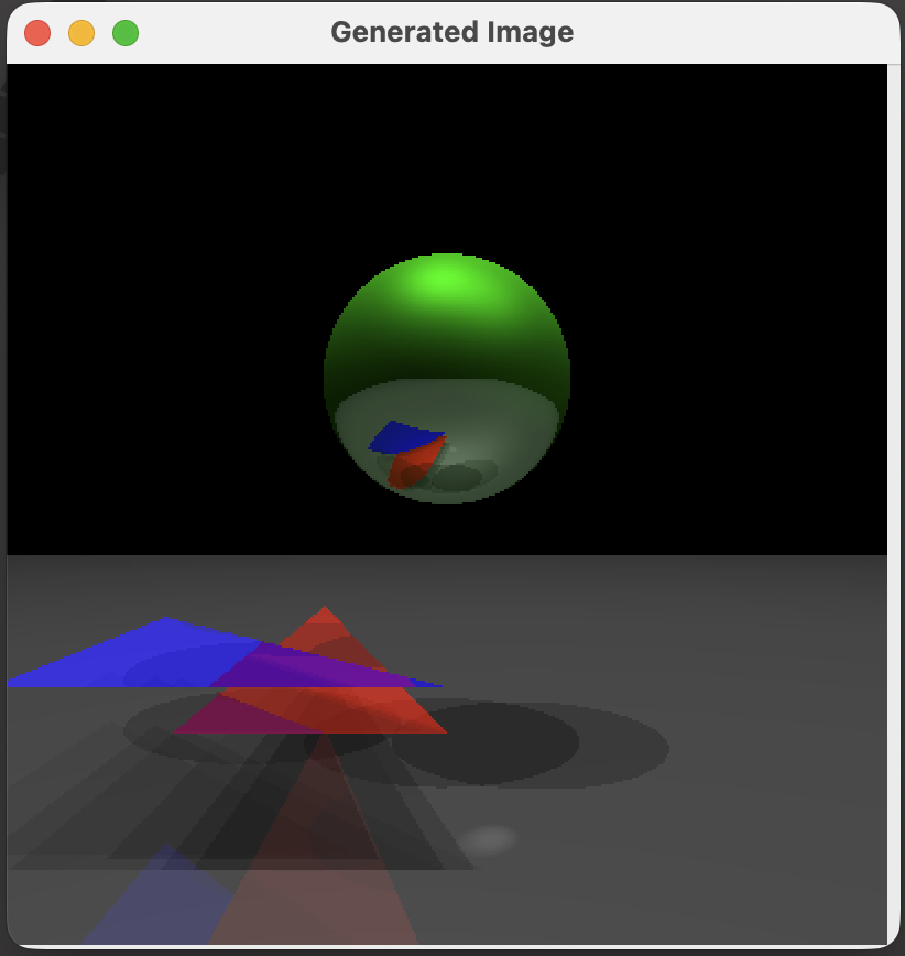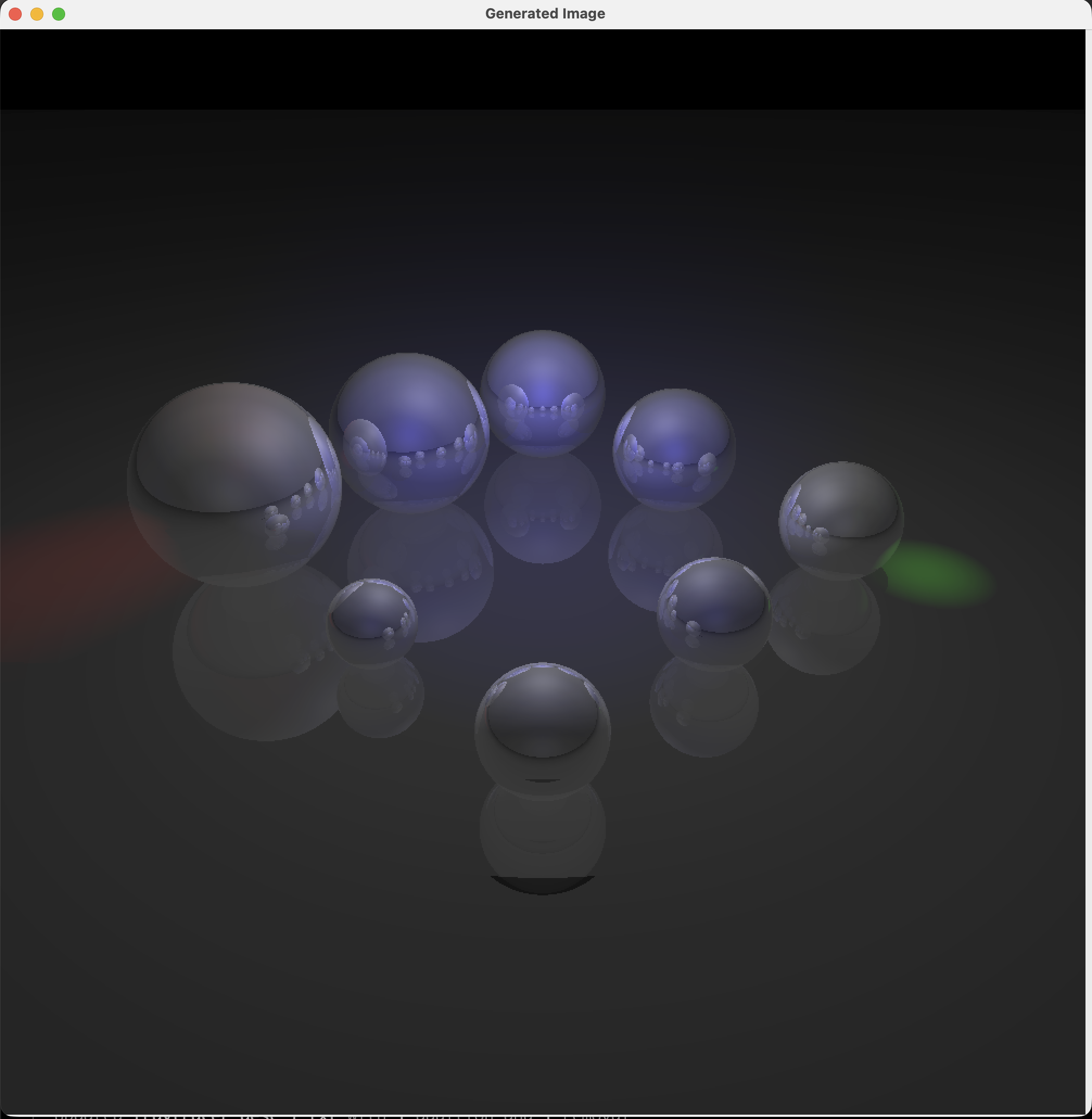 This ray tracer was built as a course project to explore the fundamentals of physically-based rendering. It implements recursive ray tracing with support for reflections, refraction, and shadows using the classic Phong illumination model. The renderer handles both sphere and polygon primitives, supports point lights and spotlights, and produces images with “realistic” lighting effects including specular highlights and colored reflections.